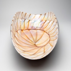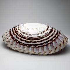 This item doesn't have an identifying label, but appears to be a Fornace Ferro Murano Italian Glass Seashell Bowl. This bowl features a shell-like design with a textured exterior, and a smoother, iridescent interior.