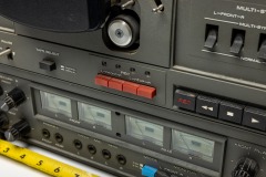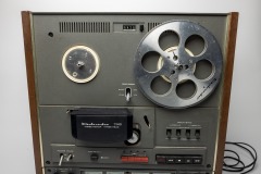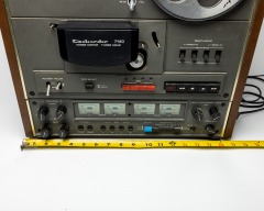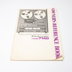 Onkyo Dokorder 7140 reel to reel tape recorder with manual and 10 reels of recorded tape. Powers on and reels spin when the play button is held in, but play button does not hold in by itself. Lights come on for front and rear monitors. Otherwise untested. Used, please see pictures for condition.